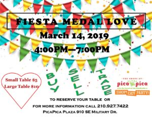 « All Events This event has passed. Fiesta Medal Love March 14, 2019 @ 4:00 pm - 7:00 pm « Loteria Grupo Rompe » Join us for some Fiesta Medal fun! Buy, Sell and Exchange! Call 210-927-7422 for more information! Add to calendar Google Calendar iCalendar Outlook 365 Outlook Live Details Date: March 14, 2019 Time: 4:00 pm - 7:00 pm Venue PicaPica Plaza 910 SE Military Dr San Antonio, TX 78214 United States + Google Map Phone (210) 927-7422 View Venue Website