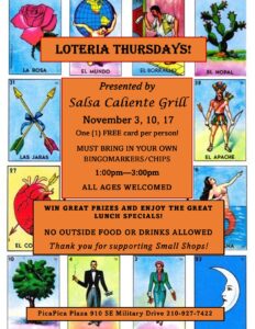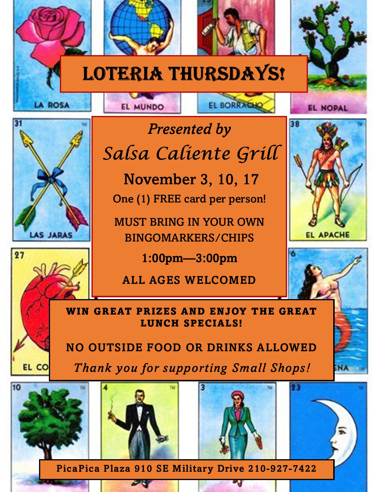 Bring the family and have some fun playing Loteria with Salsa Caliente Grill! Free for everyone, one card per person, absolutely no outside food or drinks.