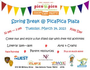 « All Events This event has passed. Spring Break @ PicaPica Plaza! March 14, 2023 @ 12:00 pm - 3:00 pm « Fiesta Medal Love Fiesta Medal Love Day » Add to calendar Google Calendar iCalendar Outlook 365 Outlook Live Details Date: March 14, 2023 Time: 12:00 pm - 3:00 pm